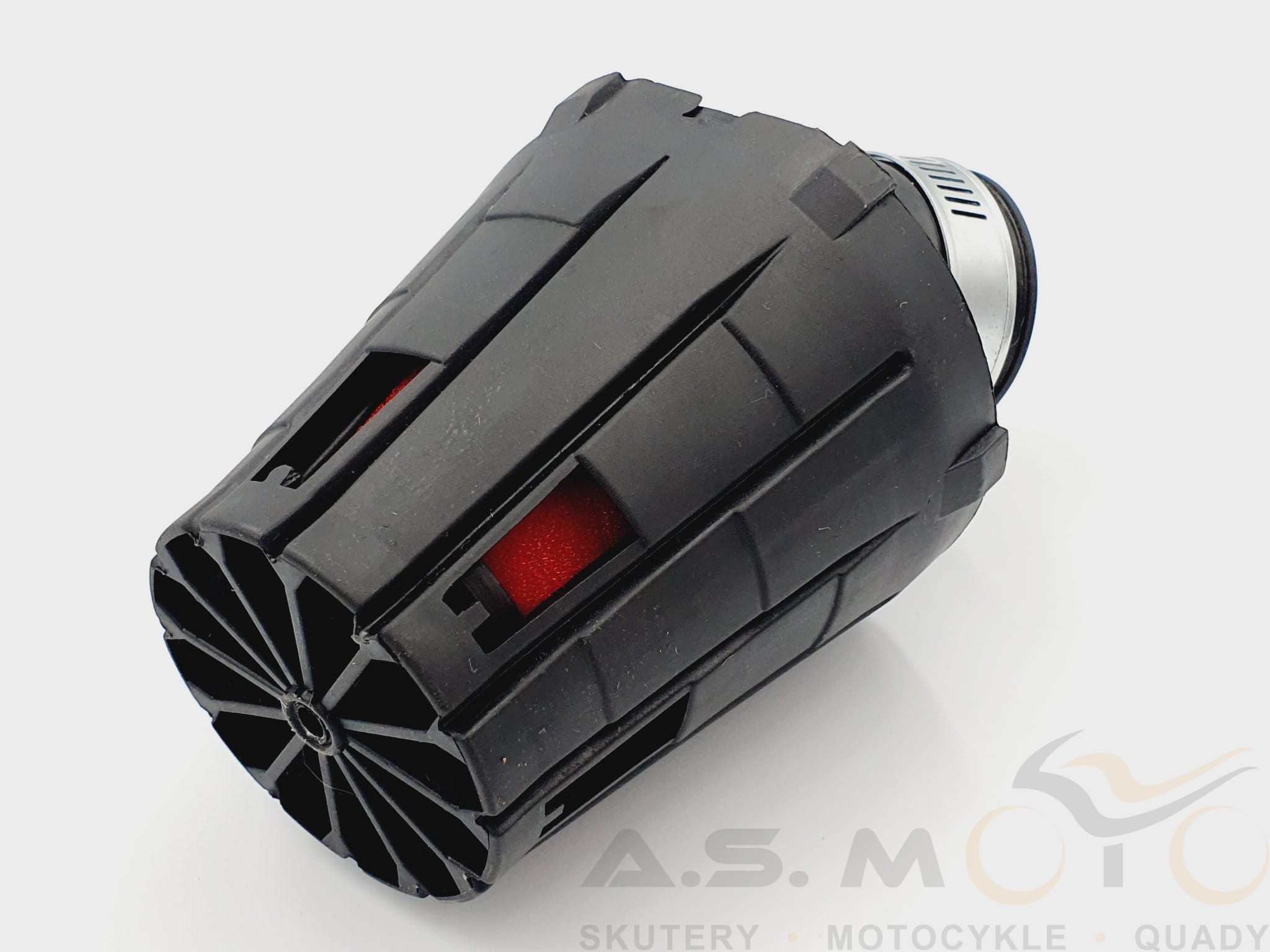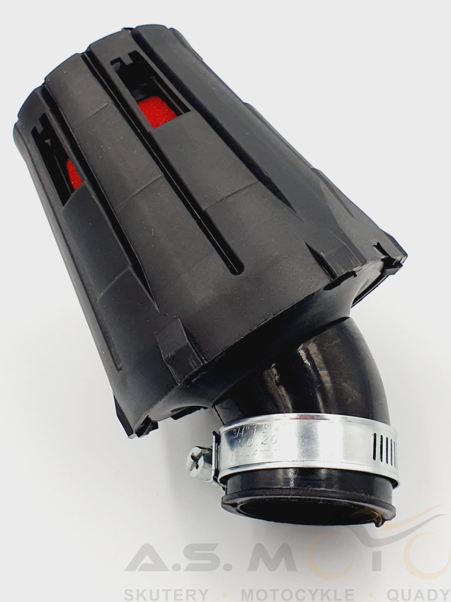 Filtr powietrza stożkowy z zagiętym króćcem 45 stopni. Filtr posiada obudowę, dzięki której wkład jest chroniony przed wodą czy też kurzem. Po montażu, gaźnik może wymagać regulacji czy też zmiany dyszy głównej. W zestawie obejma.