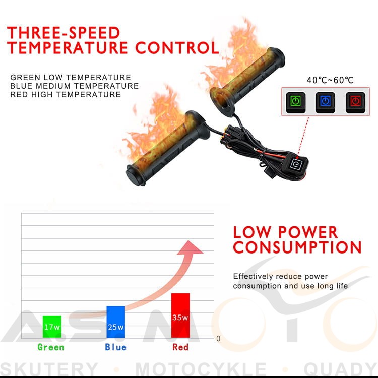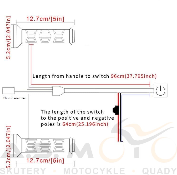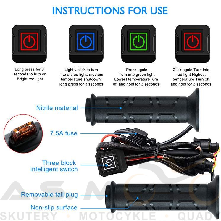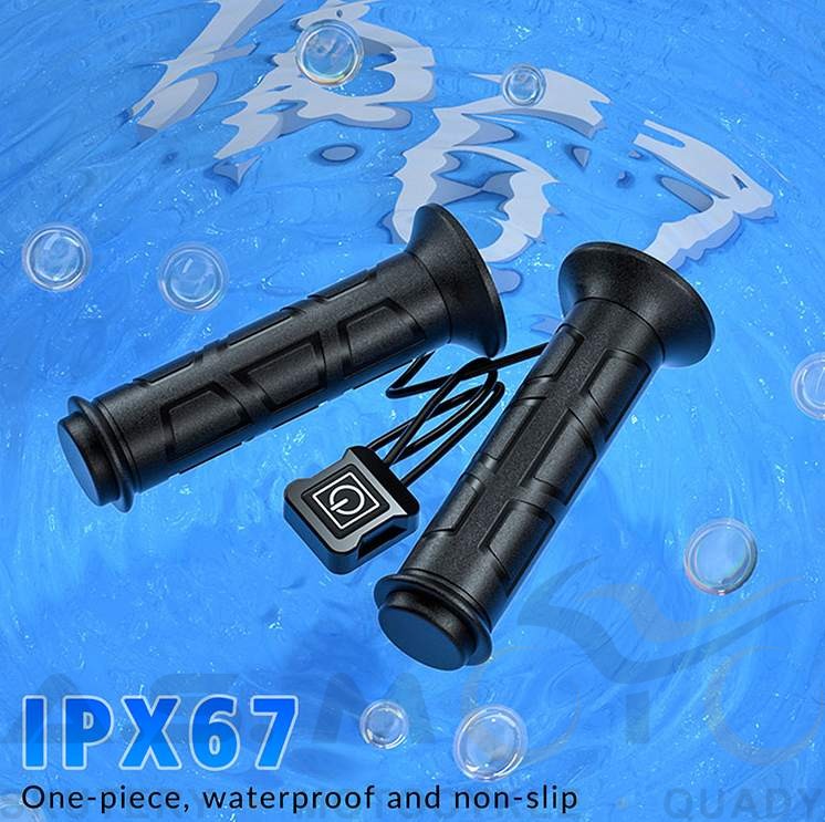 Zestaw podgrzewanych manetek z podgrzewanym kciukiem przeznaczony do różnego rodzaju quadów. Sterownik mocowany pod lusterko, 3 stopnie grzania: 40, 50, 60 stopni, podgrzewany kciuk z taśmą 3M i opaską termokurczliwą, hermetyczne wtyczki. Zestaw całkowicie wodoszczelny.