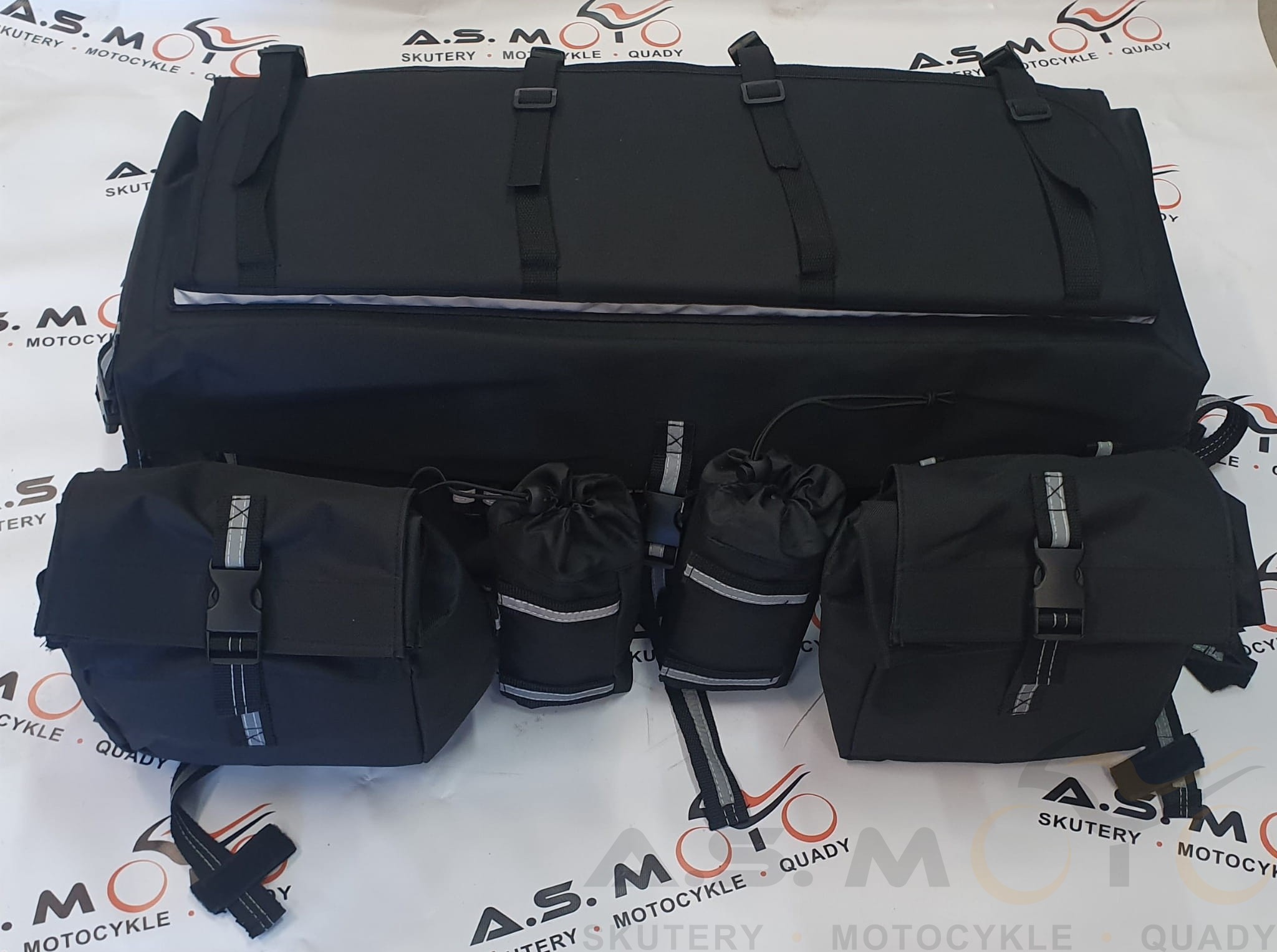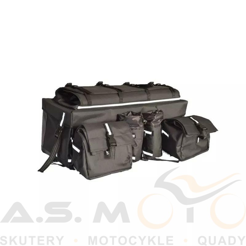 Wodoodporna torba do quada w kolorze czarnym. Oprócz torby głównej w zestawie mamy 2 mniejsze torby-sakiewki oraz 2 torby-bidony.